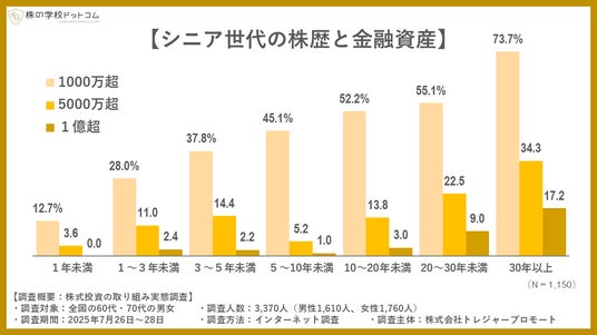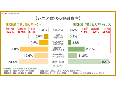 シニア世代のうち株式投資に取り組んでいる人は3割を超え、そのうち半数近い人が1000万円を超える金融資産を保有していると回答しました。1億円の資産を持つ人も5.1%に上り、株式投資をやっていない人と比べると大きな差が生まれています。また、株歴30年以上の人では、3割を超える人が5000万円以上の金融資産を築いています。