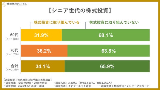 9月15日は「敬老の日」。オンライン株式スクール「株の学校ドットコム」(運営会社:株式会社トレジャープロモート、東京都千代田区、代表取締役社長:瀬川 丈)では、全国の1万人を対象に実施した株式投資に関するアンケート調査から、60代・70代のシニア世代3,370人分の回答を抽出した分析結果をまとめました。