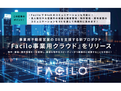 Facilo事業用クラウド』(以下、事業用クラウド)をリリースしました。従来の実需用不動産向けのプロダクトラインナップに、法人取引や大型案件を扱う「事業用不動産」に特化した新プロダクトを追加。法人取引や大型案件に求められる複雑な顧客管理・物件管理・関係者間コミュニケーションを、DX(デジタルトランスフォーメーション)の推進を通じて一元化・可視化し、BtoBの不動産取引における情報提供と提案スピードを飛躍的に高めることで、業務効率化と顧客体験の向上を支援します。