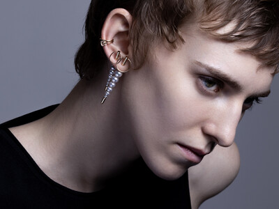 Hirotakaのシグネチャーである「SPEAR/スピア」は、耳を穿つという原始的な行為をデザインの本質と捉え、静かな強さとエレガントな反骨精神を表現。