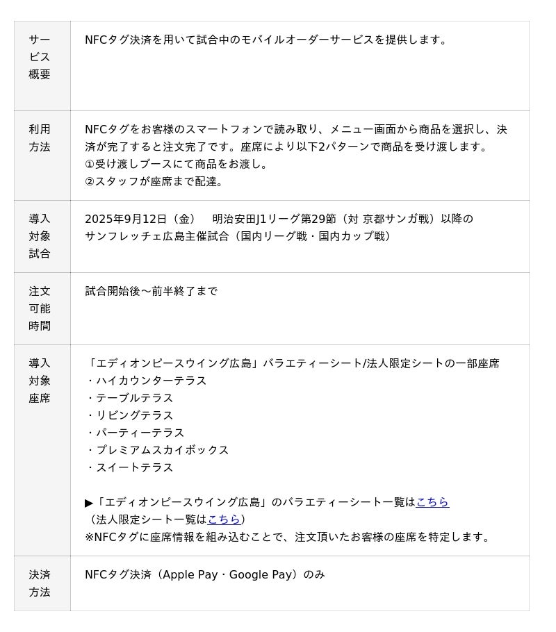 株式会社ジェーシービー (本社:東京都港区、代表取締役会長兼執行役員社長:二重 孝好、以下:JCB)と株式会社サンフレッチェ広島(本社:広島県広島市、代表取締役社長:久保 雅義、以下:サンフレッチェ広島) は2025年9月12日(金)に「エディオンピースウイング広島」にて開催される明治安田J1リーグ(京都サンガ戦)より、スマートフォンのApple Pay・Google Pay(TM) で便利に決済できる、NFCタグ決済を活用したテーブルオーダーサービスを導入いたします。
