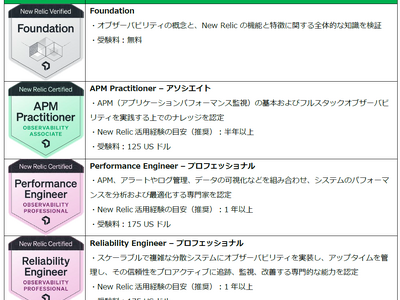 New Relic株式会社(本社:東京都中央区、以下「New Relic」)は、このたび、日本のデジタル競争力強化とDX(デジタルトランスフォーメーション)推進に不可欠なオブザーバビリティ(可観測性)人材の育成を強化するため、オブザーバビリティに関する知識・技能を認定する「認定資格制度」を刷新・強化するとともに、日本語による無料の学習コンテンツ「New Relic University(NRU)」をアップデートしました。