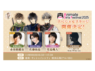 2025年11月8日(土)、9日(日)に開催されるAGF2025にて、11月9日(日)に『イケメン戦国 -永縁-』のスペシャルステージを開催します。本ステージでは、MCに「猿飛佐助」役の赤羽根 健治さん、ゲストには「黒田官兵衛」役の佐藤 拓也さん、「千利休」役の堂島 颯人さん、さらに『イケメン戦国 -永縁-』の主題歌を担当したWho-ya Extendedのボーカル、Who-ya さんをお迎えし、本作にまつわる楽しいトークや企画をお届けします。