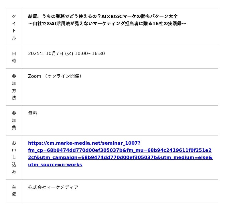 お申し込みURL:https://cm.marke-media.net/seminar_1007?fm_cp=68b9474dd770d00ef305037b&fm_mu=68b94c2419611f0f251e22cf&utm_campaign=68b9474dd770d00ef305037b&utm_medium=else&utm_source=n-works