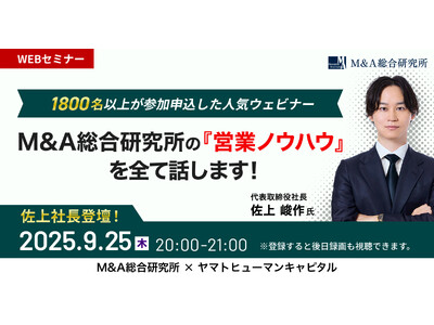 ヤマトヒューマンキャピタル株式会社(本社:東京都千代田区、代表取締役:堀江 大介)は、2025年9月25日(木) 20:00より、株式会社M&A総合研究所 代表取締役社長 佐上 峻作 氏にご登壇いただくウェビナー『M&A総合研究所の営業ノウハウを全て話します!』を開催いたします。