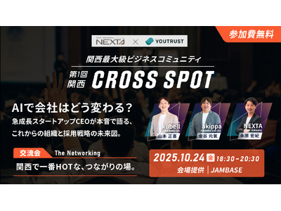 株式会社ネクスタ(本社:大阪府大阪市、代表取締役:永原宏紀)は、株式会社YOUTRUST(本社:東京都渋谷区、代表取締役:岩崎由夏)と共同で、2025年10月24日、関西のスタートアップエコシステム醸成を目的としたイベント「Cross Spot」をJAMBASE(大阪市北区)で開催します。