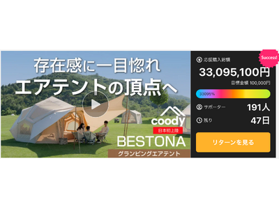 韓国発のラグジュアリーエアテントブランド「coody(クーディ)」は、最新モデル「BESTONA(ベストナ)」Makuakeにて先行販売を開始し、初日で3,300万円を超える応援購入を獲得しました。