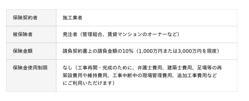 たとえば、請負金額が2億円の工事で施工業者が工事の中途で倒産した場合、発注者は最大2,000万円の補償を受けられ、その資金を使って工事再開の準備や残工事の実施をすることができます。工事再開までの仮設足場維持費や倒産した施工業者と協議するために委託した弁護士費用、出来高(工事の完了した部分の請負金額)の査定や残工事の当初の請負金額との差額も保険金から支払うことができるため、実務的な安全網としての信頼性が高い制度となっています。