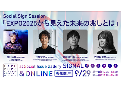 株式会社SIGNING(サイニング、本社:東京都港区、代表取締役社長:牧 貴洋、以下SIGNING)は、2025年大阪・関西万博のテーマ事業プロデューサー 宮田 裕章氏と催事企画プロデューサー 小橋賢児氏をお招きし、万博から未来社会への道筋を探る特別トークセッションを開催いたします。「いのち輝く未来社会のデザイン」をテーマに、184日間にわたって夢洲で開催されている大阪・関西万博。そこから見えた未来の兆しを、万博主催者催事 One World,One Planet. でクリエイティブディレクターを務める亀山淳史郎がホストとなって万博プロデューサーのお二人と議論し、ここでしか聞けないトークセッションをお届けします。