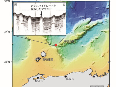 2004年頃より東京大学、明治大学、千葉大学、海洋研究開発機構、産総研等による共同学術調査によって、日本列島沿いの日本海の海底には、海底下深部で生成した天然ガスの移動・逸脱構造としてのガスチムニーや、ガス逸脱に伴う特異地形、マウンド、ポックマークが広く分布していることが明らかになっています(参考文献1)。また、新潟県や秋田県の沖合では、今回と同様の塊状メタンハイドレートが採取されています(参考文献2)。これら特異地形や構造が密集している隠岐諸島沖(隠岐海嶺)では採泥調査が進んでおらず、塊状ハイドレートは採取されていませんでした。今回の発見を契機にハイドレート分布調査が進めば、日本海のメタンハイドレートの分布範囲が拡大し、資源量も増大すると考えられます。