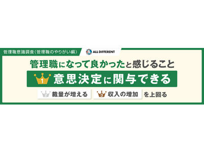 累計20,000社450万人以上の組織開発・人材育成を支援するALL DIFFERENT(オールディファレント)株式会社(所在地:東京都千代田区 代表取締役社長:眞崎大輔)および「人と組織の未来創り(R)」に関する調査・研究を行うラーニングイノベーション総合研究所(R)は、5月20日~7月17日の期間で、管理職531名を対象に「管理職意識調査」を行いました。本リリースでは、「管理職になって良かったこと」にフォーカスし、管理職の属性ごとに回答を比較分析した結果を公表します。