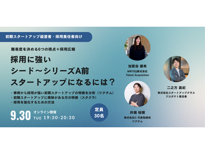 スタートアップ特化のスカウトプラットフォーム 「スタクラ」を運営する株式会社スタートアップクラス、初期スタートアップ特化の人×AIのハイブリッドオペレーションによる採用立ち上げ・支援サービス 「ツクチム」を運営する株式会社C、スタートアップのHR/HRPRに深い知見を持つMNTSQ株式会社は、2025年9月30日(火)に、スタートアップ経営者・採用責任者向けウェビナーをオンラインで開催いたします。