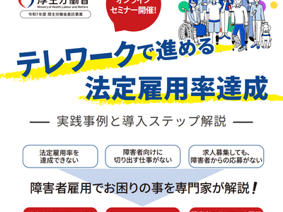 株式会社テレワークマネジメント(本社:北海道北見市、代表取締役:田澤由利)は厚生労働省より委託を受けた事業の一環で「テレワークで進める法定雇用率達成―実践事例と導入ステップ解説」セミナーを開催します。