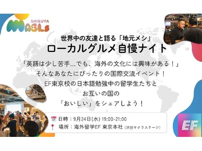 日本から海外へ飛び立つ留学生をサポートし続け50年以上の歴史を持つ老舗語学留学学校の海外留学EF(イーエフ)ことイー・エフ・エデュケーション・ファースト(日本法人:イー・エフ・エデュケーション・ファースト・ジャパン株式会社〈本社:東京都渋谷区、代表取締役社長:伊東グロニング七菜〉、以下EF)は、日本語語学学校「EF東京校」と、東急不動産が運営する渋谷特化型コミュニティアプリ「MABLs(渋谷マブルス)」と協力し、情報の発信基地・渋谷から行う初の共同イベントとして、国際交流イベント「世界の地元メシ、大集合!ローカルグルメ自慢ナイト」を開催いたします。