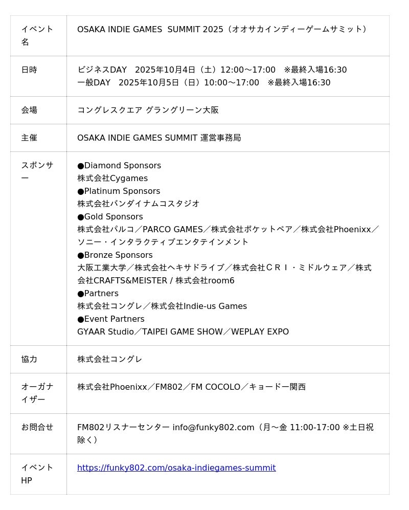株式会社Phoenixx(フィーニックス)(東京都武蔵野市、代表取締役社長:坂本 和則)は、本日より『OSAKA INDIE GAMES SUMMIT』一般DAYのチケット販売を開始したことをお知らせいたします。