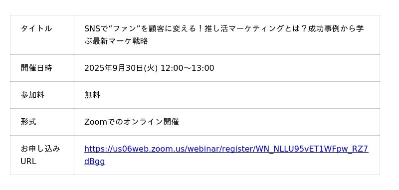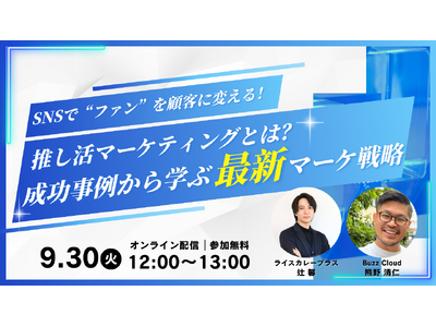 購入を前提とした推し活マーケティング支援を行うBuzzCloud株式会社(本社:東京都港区、代表取締役:大西 照弘)は、株式会社ライスカレープラス(東京都渋谷区、代表取締役:辻 馨)と共に、【SNSで“ファン”を顧客に変える!推し活マーケティングとは?成功事例から学ぶ最新マーケ戦略】と題したウェビナーを、 9/30(火)12時に開催いたします。