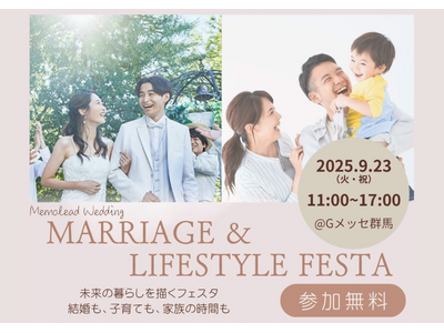 2025年9月23日(火・祝)、群馬県高崎市のGメッセ群馬にて「マリッジ&ライフスタイルフェスタ2025」を開催いたします。本イベントは「結婚」「子育て」「ライフスタイル」をテーマに、カップルからファミリーまで幅広い世代が楽しめる一日限りの大規模フェスタです。主催:(株)メモリードグループ(Memolead Wedding)/協力:MEWKS群馬県内の複数式場を展開するメモリードグループが、結婚・子育て・ライフスタイルを横断して体験できる一日をお届けします。この1日で人気式場を比べてあなたにピッタリな式場がみつかる。