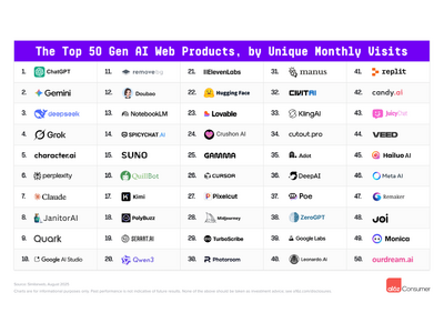 2025年8月27日に公開された「The Top 100 Gen AI Consumer Apps - 5th Edition」は、過去2年半のデータをもとに、グローバルに最も利用されている生成AI対応のウェブおよびモバイルアプリをランキング形式で紹介。