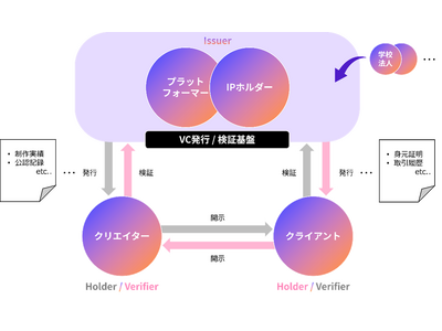 また、Verifiable Presentation(以下、VP)*4登録機能として、「クリエイターVP」「コンテンツVP」「パッケージVP」の3種類を用意。各VPはウォレットと連携して登録され、認証マーク付きで表示されます。また、パッケージVPでは、複数のクリエイターやVPを統合し、出品情報との連携も可能です。