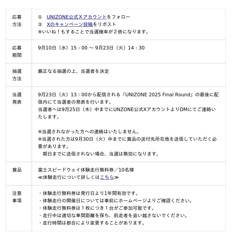 UNIZONE 2025を応援してくださった感謝の気持ちを込めて、富士スピードウェイの体験走行無料券をプレゼントするキャンペーンを実施中です。一緒にUNIZONE 2025のクライマックスを盛り上げながら、是非キャンペーンにご参加ください。