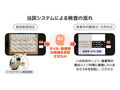 当該システムの従来バージョンでは、タイルと接着剤が同系色の場合、接着率の判定が正確に行われないケースがありました。新バージョンでは、新開発のAI画像認識技術セグメンテーションモデル※1を採用することによって、iPhoneカメラでタイル裏面を撮影し測定範囲を指定するだけで、色彩に関係なく接着率の算出および均等な接着を判別し、合否判定を行うことが可能です。また、従来バージョンと同様※1に、建設現場で正確かつ客観的な検査および記録が即時に行え、事務所で検査記録が自動で作成できます(特許出願中)。これにより、外壁タイル施工における検査業務全体の約65%(約12時間)の削減を実現します。