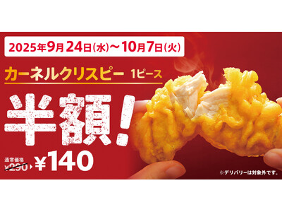 日本ケンタッキー・フライド・チキン株式会社(社長:遠藤 久、本社:神奈川県横浜市)は、全国のケンタッキーフライドチキン(以下:KFC)店舗で、「カーネルクリスピー1ピース半額」キャンペーンを、9月24日(水)から10月7日(火)の2週間限定で実施します。