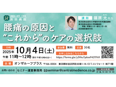 株式会社セントラルメディエンス(本社:東京都港区、代表取締役:中川隆太郎、以下「当社」)の提携先医療機関である、医療法人財団 小畑会 浜田病院(所在地:東京都千代田区、院長:合阪幸三、以下「当院」)は、10月4日(土)に杉並区阿佐ヶ谷で女性の腰痛に関するセミナーを開催いたします。