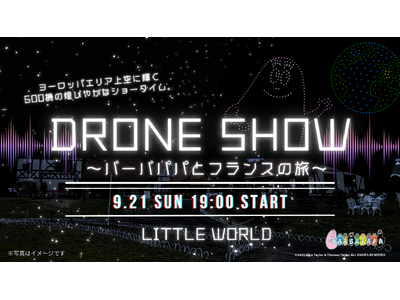 本ドローンショーは、リトルワールドにて開催されるフランス生まれの人気キャラクター「バーバパパ」とのコラボレーションイベント「ドローンショー~バーバパパとフランスの旅~」で、SkyDriveが企画・運航を担当します。500機のドローンがリトルワールドのヨーロッパエリア上空の夜空にバーバパパを描き、フランスの風景へと誘います。