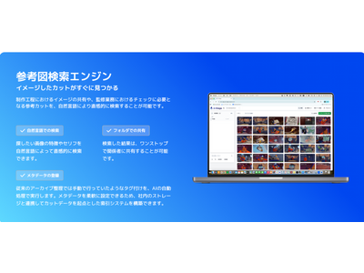 AI Mageが提供する「参考図検索エンジン」は、自然言語を用いてイメージしたカットを即座に探し出せるシステムです。本システムは、制作工程におけるイメージの共有や、監修業務における確認作業に必要な参考カットを、自然言語により直感的に検索することを可能にします。主な特徴は以下の通りです。