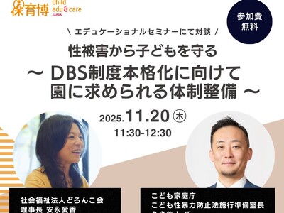 内容:日本版DBS(こども性暴力防止法)がいよいよ2026年末から施行予定です。具体的な制度の内容や保育事業者として求められる体制整備、職員研修の実施などの対応について、こども家庭庁担当室長の久米氏と安永理事長が対談形式で紹介いたします。