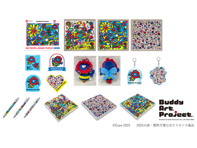 この度、このコラボレーションアートを使用した、ぬいぐるみや、Tシャツ、アクリルキーホルダーなどの商品群が公式ライセンス商品として、9月19日(金)より、2025大阪・関西万博 会場内・会場外オフィシャルストア等で販売します。またバディアートプロジェクトは、2025大阪・関西万博公式ライセンス商品の企画・製造・販売における収益の一部を、障害者福祉施設・団体へ還元する取り組みも行います。