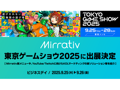 「All for Streamers」のコンセプトで、YouTube・Twitch・Mirrativなどの各配信プラットフォームで活動する配信者(VTuber/ストリーマー等)を支援する株式会社ミラティブ(本社:東京都目黒区 代表取締役:赤川隼一)は、2025年9月25日(木)~28日(日)の4日間、幕張メッセで開催される「東京ゲームショウ2025(TOKYO GAME SHOW 2025)」のビジネスデイにおいて、9月25日(木)と26日(金)の2日間、ビジネスソリューションコーナーに出展することをお知らせいたします。