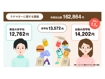 また、男女で比較すると、女性の“ラテマネー”月平均は14,202円となり、男性の月平均(12,762円)と比べて1.1倍であることがわかりました。