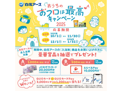 白元アース株式会社(本社:東京都足立区、社長:吉村一人)は、同社の入浴剤各種を購入し応募いただくと、抽選で「JCBギフトカード20,000円分」や「えらべるPay10,000円分」が当たる『おうちのおフロは最高キャンペーン2025』を10月1日から実施いたします。