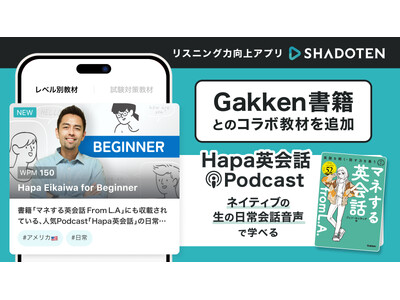 英語学習プラットフォームの株式会社プログリット(本社:東京都港区浜松町、代表取締役社長:岡田 祥吾、証券コード:9560)が提供する、リスニング力を向上させるサブスク型英語学習サービス「シャドテン」は、株式会社 Gakken(本社:東京都品川区、代表取締役社長:南條 達也、以下Gakken)より発売された書籍『マネする英会話 from L.A.』とコラボレーションし、同書に収録されたHapa英会話Podcastの“生の英会話”音声18課題を、シャドテンの新教材として2025年9月19日より提供開始いたします。本コラボにより、ネイティブスピーカーの日常会話特有の、言い淀み・口癖・スラングを含む“リアルな英語”でシャドーイング学習が可能となり、会議前のスモールトークなど雑談に対応できるリスニング力を養うことができます。