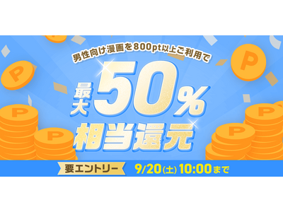 めちゃコミック(めちゃコミ)」WEB版において、2025年9月19日(金)10:00から2025年9月20日(土)10:00までの期間中、男性向け漫画を対象に「最大50%ポイント還元キャンペーン」を実施します。