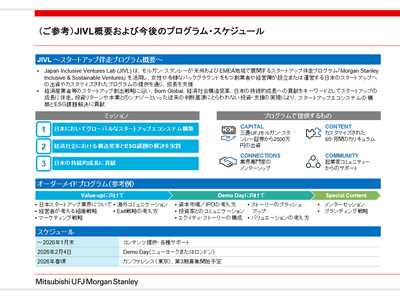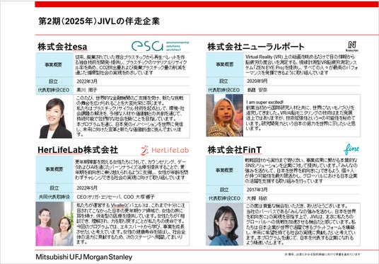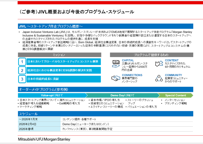 三菱UFJモルガン・スタンレー証券株式会社(取締役社長 小林 真、以下 当社)は、2025年3月5日に募集開始を公表しました、スタートアップ伴走プログラム「Japan Inclusive Ventures Lab」(以下 JIVL)において、株式会社esa、株式会社ニューラルポート、HerLifeLab株式会社および株式会社FinTの4社を第2期の伴走企業として採択したことをお知らせします。当社は、伴走プログラムの一環として、採択した企業への出資も予定しています。現在、出資にかかる契約締結に向けて準備を進めておりますので、公表の準備が整い次第、速やかにお知らせします。