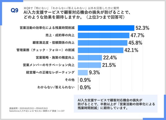 AI入力支援で顧客対応機会の損失を防げた場合、52.3%が「残業時間削減」、47.7%が「売上向上」に効果を期待