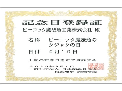 ピーコック魔法瓶工業株式会社(本社;大阪市、社長;山中千佳)は、当社の75周年記念事業の一環として、毎年の9月19日を、「ピーコック魔法瓶のクジャクの日」に制定し、一般社団法人「日本記念日協会」に記念日登録されましたことを報告いたします。