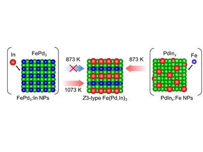 本研究では、精密なナノ粒子合成により設計した2種類のナノ粒子- FePd3合金へのIn拡散(FePd3:Inナノ粒子)とPdInx合金相へのFe拡散(PdInx:Feナノ粒子)-に対して還元熱処理を施した結果、PdInx:Fe ナノ粒子に比べてFePd3:Inナノ粒子の方が、Z3型Fe(Pd, In)3合金ナノ粒子の形成に必要な温度が200 Kも高いことを発見しました。この温度差について調査するために、原子拡散過程を原子レベルに追跡したところ、非相溶な元素ペアであるFeとInの隣接の有無に原因があることを見出しました。第一原理計算により2種類の出発ナノ粒子の原子拡散過程で形成される中間構造の形成エネルギーを求めたところ、FeとInが隣接することで構造が大きく不安定化することが確認され、その分原子相互拡散の活性化障壁も高くなることが分かりました。