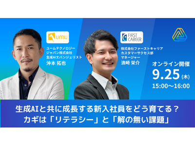 パフォーマンス向上を支援するAI活用学習プラットフォーム「UMU(ユーム)」を展開するユームテクノロジージャパン株式会社(本社:東京都新宿区、代表取締役:松田 しゅう平、以下 ユームテクノロジージャパン)は、株式会社ファーストキャリア(本社:東京都渋谷区、代表取締役社長:井上 卓哉)と共同で、「生成AIと共に成長する新入社員をどう育てる?カギは『リテラシー』と『解の無い課題』」と題するオンラインセミナーを、2025年9月25日(木)15:00より開催いたします。