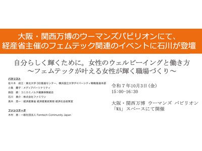 https://famione.com/benefit/などを展開する株式会社ファミワン(本社:東京都渋谷区、代表取締役:石川勇介)の代表取締役である石川は、経済産業省による令和7年度「フェムテック等サポートサービス実証事業費補助金」補助事業の一環として10月3日(金)に「大阪・関西万博 ウーマンズ パビリオン「WA」スペース」にて開催される、『自分らしく輝くために。女性のウェルビーイングと働き方 ~フェムテックが叶える女性が輝く職場づくり~』と題したイベントに、パネリストとして登壇します。
