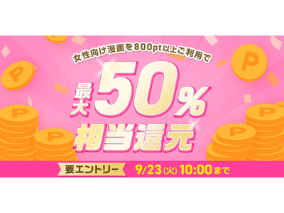めちゃコミック(めちゃコミ)」WEB版において、2025年9月22日(月)10:00から2025年9月23日(火)10:00までの期間中、女性向け漫画を対象に「最大50%ポイント還元キャンペーン」を実施します。