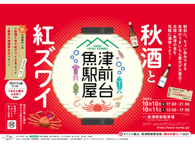 魚津観光まちづくり株式会社(富山県魚津市釈迦堂1丁目13-11、代表取締役 四十万隆一)は2025年10月10日(金)と11日(土)の2日間、魚津産の紅ズワイガニと地酒を気軽に満喫できる屋台イベント「魚津駅前屋台~秋酒と紅ズワイ~」(魚津市共催)を、あいの風とやま鉄道の魚津駅前で初開催します。