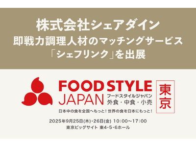 株式会社シェアダイン(本社:東京都港区、代表取締役:飯田陽狩)は、2025年9月25日(木)~26日(金)に東京ビッグサイトで開催される「FOOD STYLE JAPAN 2025 <東京>」に出展いたします。展示ブース(小間番号:6A-8)では、料理人と飲食事業者をつなぐ総合プラットフォーム「CHEFLINK(シェフリンク)※」を紹介し、実際の導入事例やプラットフォームの仕組みを通じて、柔軟な人材活用の新しい可能性をお伝えします。