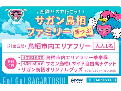 このチケットは、試合開催日に「駅前不動産スタジアム」(佐賀県鳥栖市京町812)周辺で発生する交通渋滞の緩和を目的に、家族でJRを利用して快適にサッカー観戦を楽しんでいただくための特別企画です。内容は、西鉄バス鳥栖市内1日フリー乗車券(大人1名・小児2名)、C席サイド自由の観戦チケット3枚(大人1名・小学生2名)、ノベルティグッズがセットになっており、各試合日につき100枚限定で販売されます。