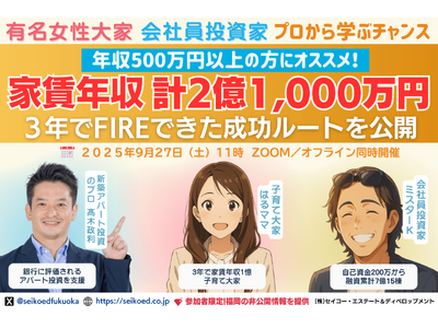 9/27開催|家賃年収計2億以上!福岡の不動産投資で短期FIRE!3年で家賃年収1億突破の有名大家×自己資金200万から15棟所有の会社員投資家から学ぶ。融資・銀行選び・物件選びはどうしてる?