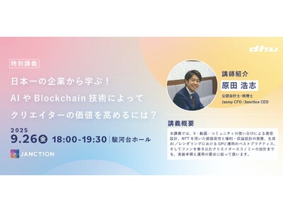 ジャスミーラボ株式会社(プロジェクト名:JANCTION、代表取締役:原田 浩志、以下「JANCTION」)は、2025年9月26日(金)にデジタルハリウッド大学にて、特別講義「日本一の企業から学ぶ!AIやBlockchain技術によってクリエイターの価値を高めるには?」を開催いたします。