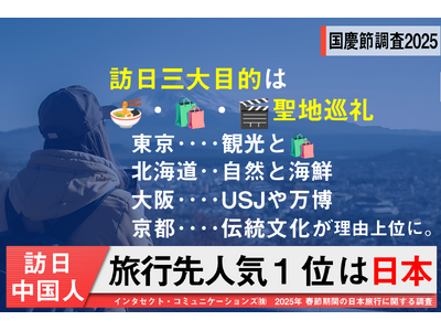 中国・台湾などの海外プロモーション・インバウンド支援を行うインタセクト・コミュニケーションズ株式会社(本社:東京都千代田区、代表取締役社長:譚 玉峰、以下 インタセクト)は、10月1日から始まる「国慶節」の大型連休を前に、国慶節期間中(2025年10月1日~10月8日)の日本旅行に関する最新動向を探るべく、