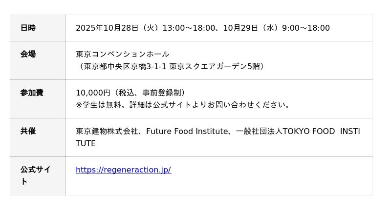 東京建物株式会社は、世界的な潮流となりつつある「リジェネレーション」をテーマにした国際カンファレンス「RegenerAction Japan 2025(リジェネアクションジャパン2025)」(以下「本カンファレンス」)を、10月28日(火)・29日(水)に東京コンベンションホール(東京都中央区京橋、東京スクエアガーデン5階)で開催しますので、お知らせします。